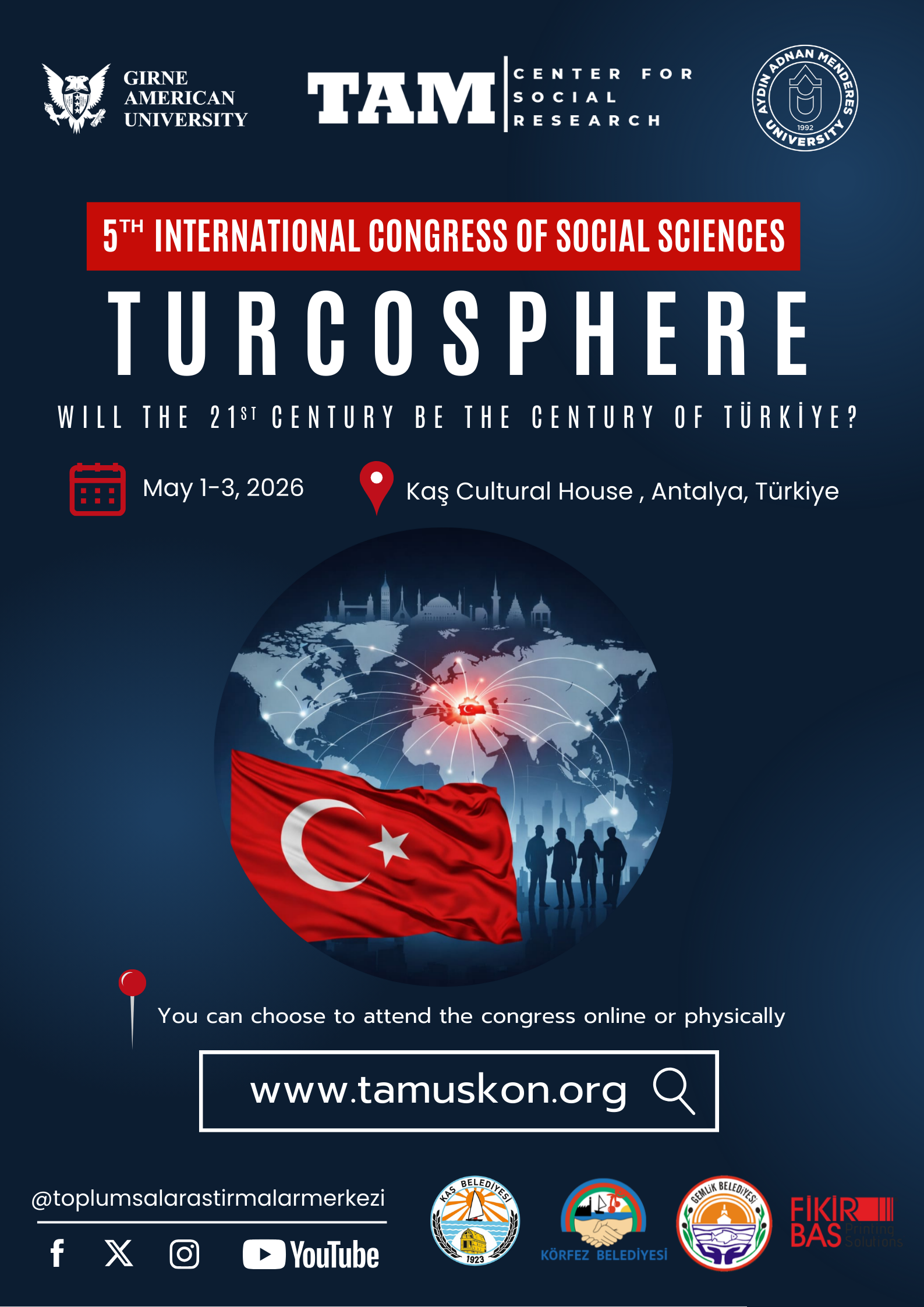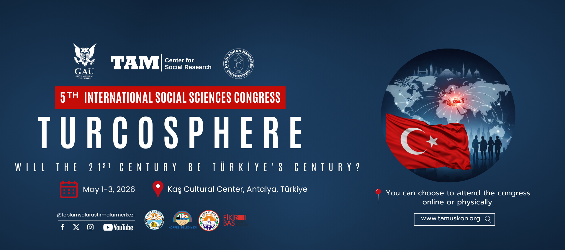 We are delighted to invite you to the 5th International Social Sciences Congress organized by the Center for Social Research (TAM), to be held on May 1–3, 2026, in the uniquely beautiful district of Kaş, Antalya, under the theme: